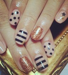 Французский маникюр вполне можно делать на коротких ногтях, и он будет выглядеть интереснее, если использовать для него нестандартные цвета. Нанесите на ногти слой бежевого лака, и когда он высохнет, покрасьте кончик лаком черного цвета. Такой маникюр на первый взгляд может напоминать очень грязные ногти, но, в целом, выглядит стильно. На бежевой части ногтя также можно нарисовать несколько мелких горошин черного цвета.